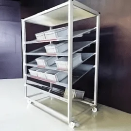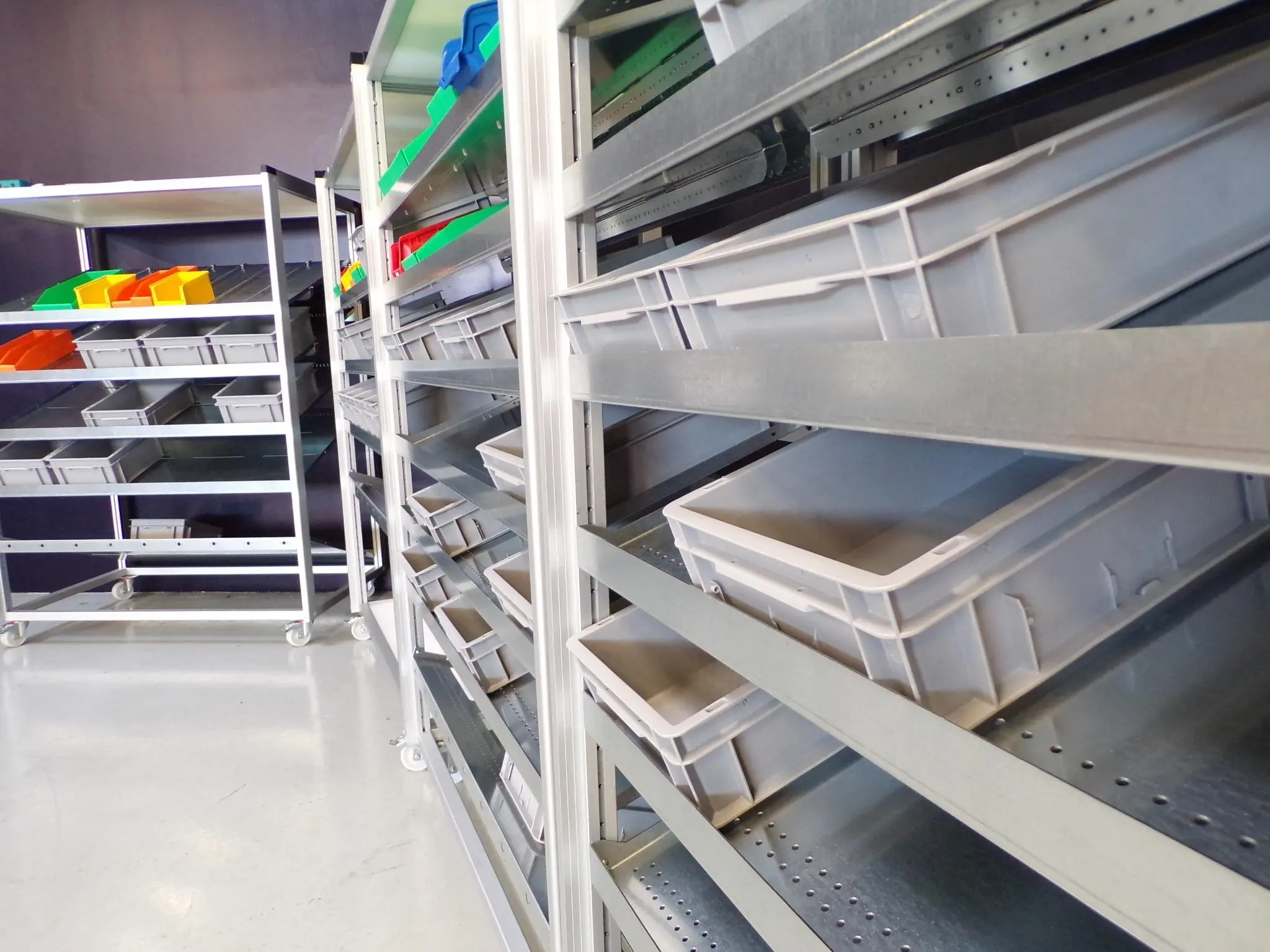 Les meubles Kanban peuvent recevoir plusieurs étages, ainsi qu’un étage « retour de bacs vides ». Ils sont montés sur roues pour faciliter leur transport et leur déplacement pour le réaménagement de zones.